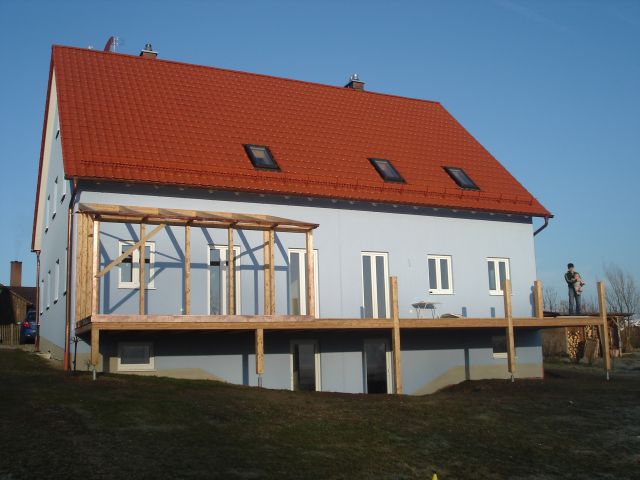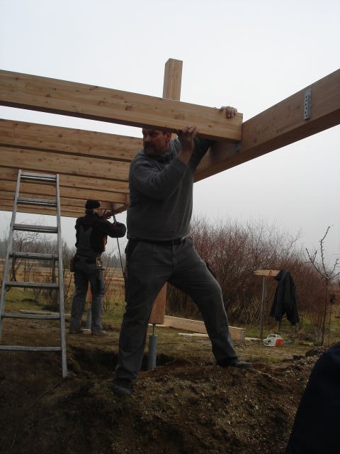 Die Leimbinder aus massiver Lärche werden mit Spezialdübeln an der Hauswand befestigt.