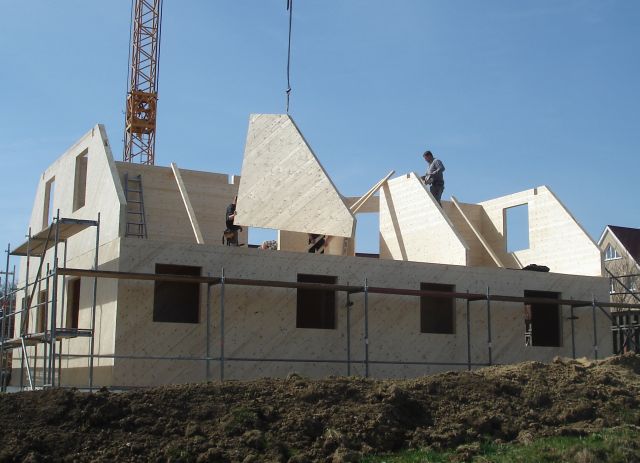 Die exakt vorgefertigten massiven Wände werden angeliefert.
