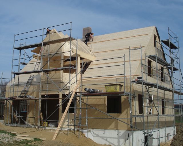 Anschließend wird das Haus außen mit Holzfasenplatten gedämmt...